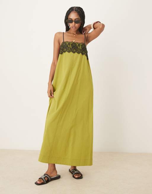 ASOS DESIGN - Midi cami-jurk met kanten bovenlaag in olijfgroen