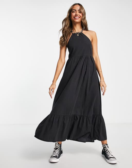 ASOS DESIGN - Midi-halterjurk van zacht denim in zwart met wassing