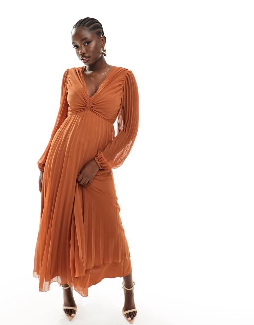 ASOS DESIGN - Midi-jurk met diepuitgesneden halslijn en geplooid lijfje in roestbruin