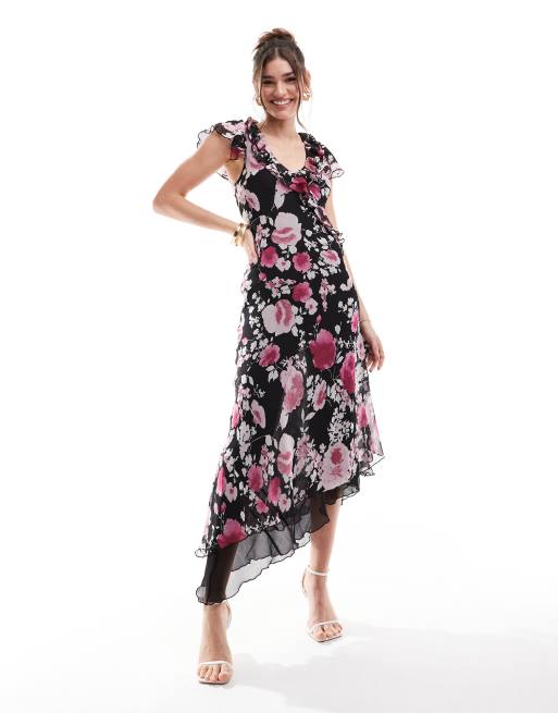 ASOS DESIGN - Midi jurk met fladdermouwen en ruches in donkere bloemenprint