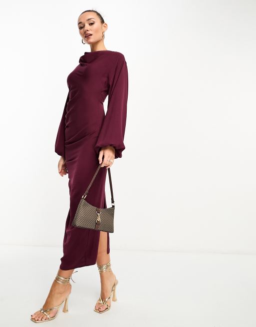 ASOS DESIGN - Midi-jurk met gedrapeerde halslijn en gerimpelde zijkant in bordeauxrood