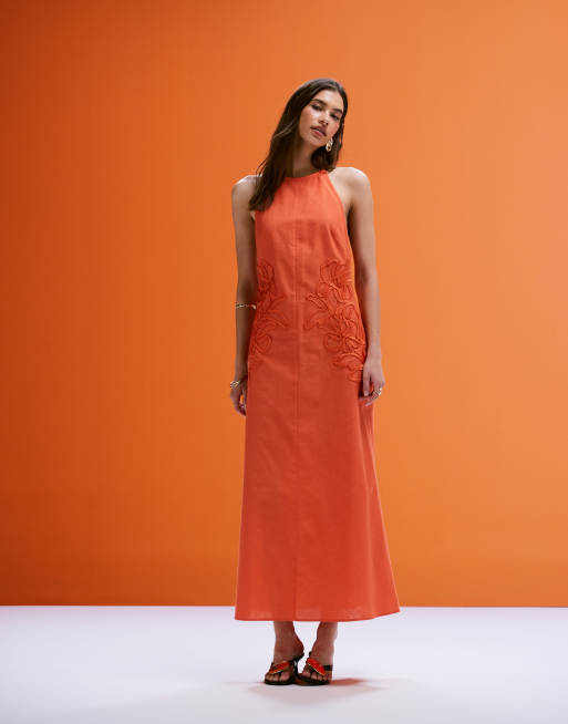 ASOS DESIGN - Midi jurk met lage rug, halternek en borduursel aan de taille in oranje