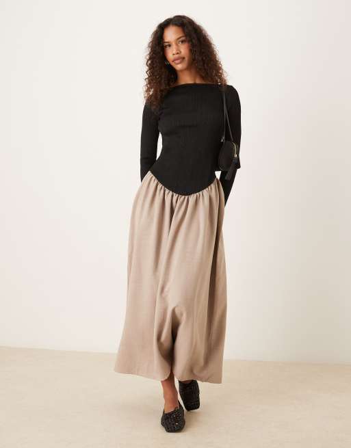 ASOS DESIGN - Midi-jurk met lange mouwen, rechte hals en verlaagde taille in zwart en beige