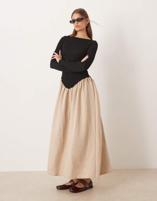 ASOS DESIGN - Midi-jurk met lange mouwen, rechte hals en verlaagde taille in zwart en beige