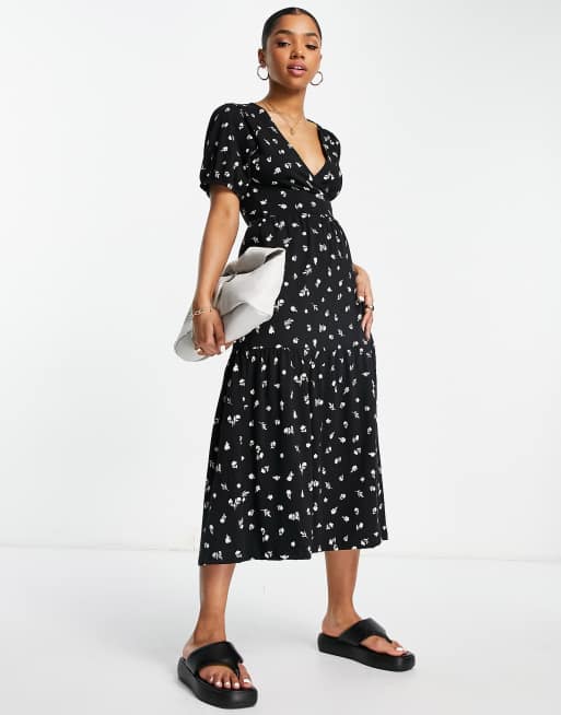 ASOS DESIGN - Midi jurk met overslag, stroken, pofmouwen en fijne print in zwart-wit