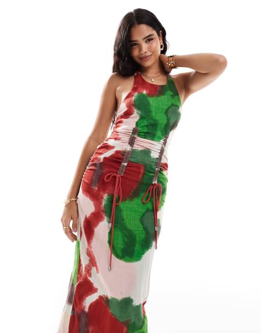 ASOS DESIGN - Midi-jurk met racerhals, trekkoord en vervaagde abstracte print