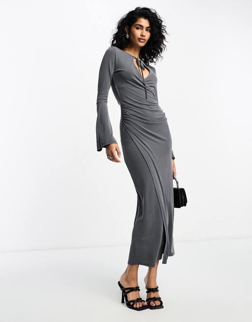 ASOS DESIGN - Midi jurk met uitlopende lange mouwen, overslag en strik aan de hals in grijs