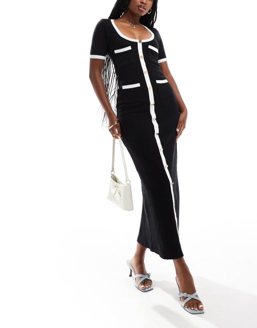 ASOS DESIGN - Midi-jurk van boucléstof met knopen en contrasterende biezen in zwart