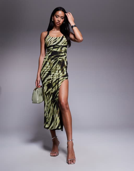 ASOS DESIGN - Midi jurk van mesh met super lage ronde hals en asymmetrische panden met rand van kant en zebraprint