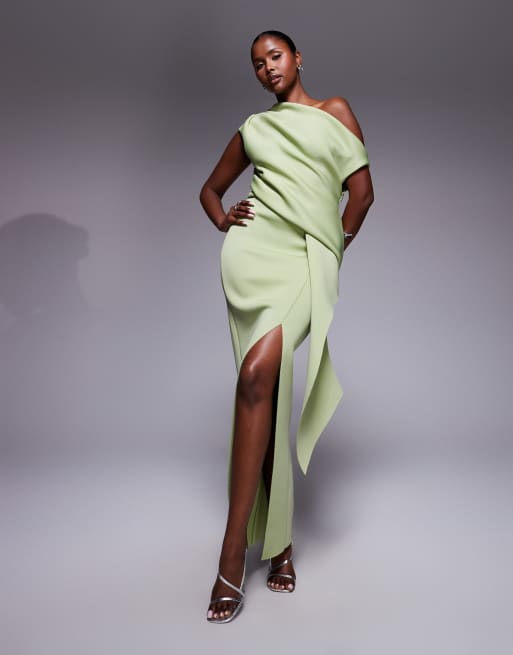 ASOS DESIGN - Midi-jurk van scuba-achtige stof met afhangende schouder en gemanipuleerde plooi in saliegroen