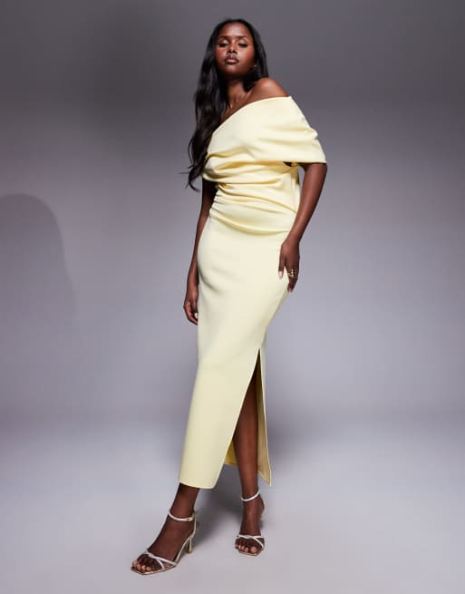 ASOS DESIGN - Midi-jurk van scuba-achtige stof met structuur en afhangende schouder in lichtgeel