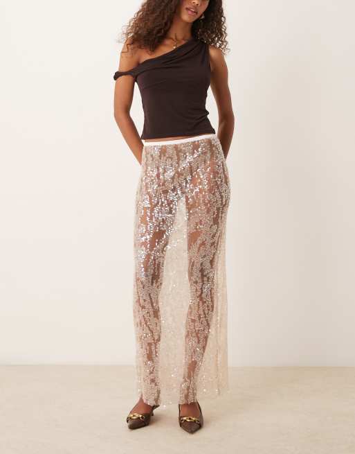 ASOS DESIGN - Midi rok van mesh met lovertjes in champagnekleur