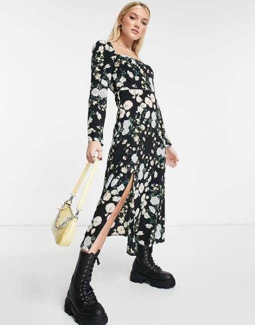 ASOS DESIGN - Midi skaterjurk met vierkante hals in zwart met bloemenprint