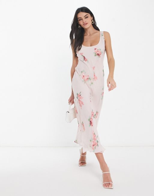 ASOS DESIGN - Midi slipdress van chiffon met lage ronde hals en bloemenprint in roze