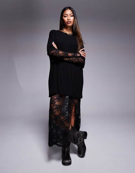 ASOS DESIGN - Midi-T-shirtjurk met kanten inzetstukken in zwart