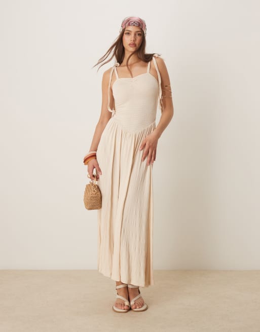 ASOS DESIGN - Midi zomerjurk van kreukelstof met gesmokt lijfje en gestrikte cami-bandjes in stone