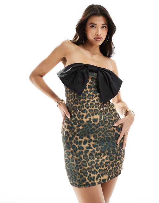 ASOS DESIGN - Mini bandeau-jurk met oversized strik in luipaardprint