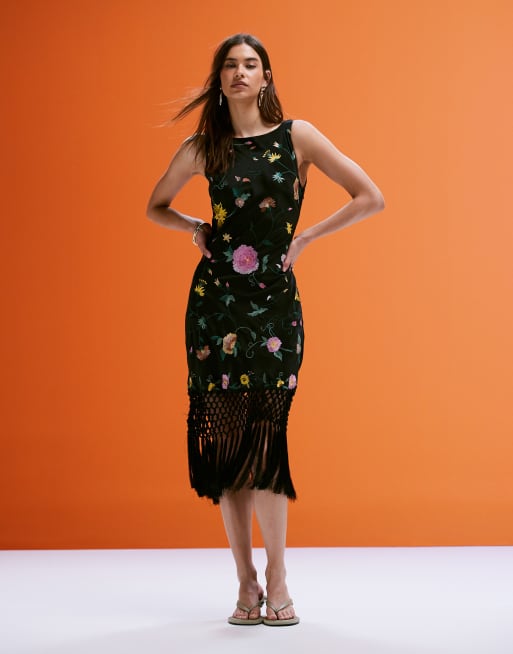 ASOS DESIGN - Mini jurk met borduursels, gedrapeerde achterkant en franjes aan de zoom in zwart