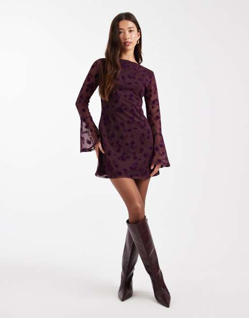 ASOS DESIGN - Mini jurk met geflockte bloemenprint en uitlopende mouwen in paars
