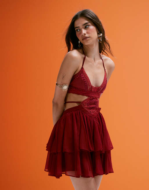 ASOS DESIGN - Mini jurk met gehaakt lijfje van imitatiesuède met uitsnijdingen en rok met stroken in donkerroze