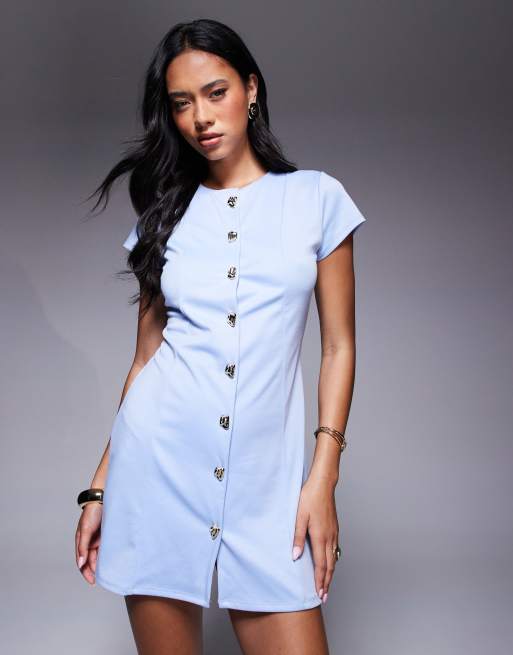 ASOS DESIGN - Mini jurk met korte mouwen, siernaden en knoopdetail in babyblauw