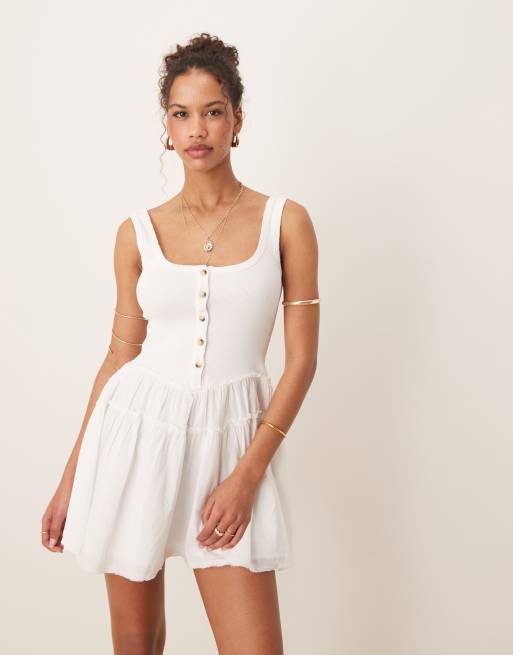 ASOS DESIGN - Mini jurk met lage ronde hals, knopen, geribbeld lijfje en poplin rok in wit