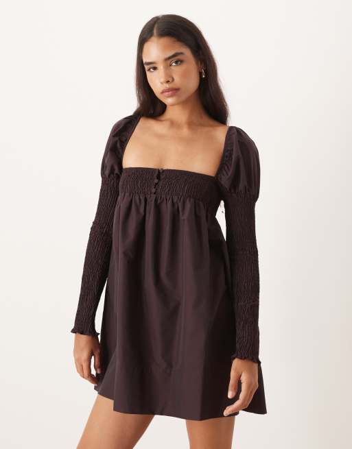 ASOS DESIGN - Mini jurk met lange mouwen, knopen aan de voorkant en gesmokte buste in donker bordeauxrood