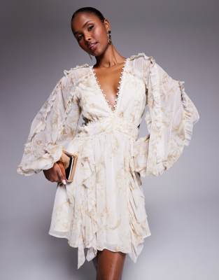 ASOS DESIGN - Mini-jurk met ruches, kantinzet en uitsnijding in zachte bloemenprint
