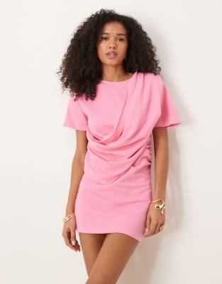 ASOS DESIGN - Mini jurk met textuur en korte mouwen en gedrapeerde voorkant in roze