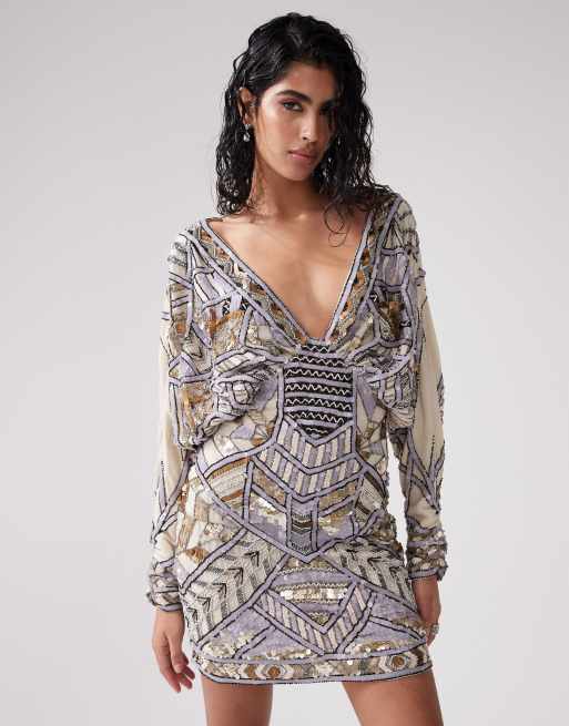 ASOS DESIGN - Mini jurk met versiering en vleermuismouwen in stone
