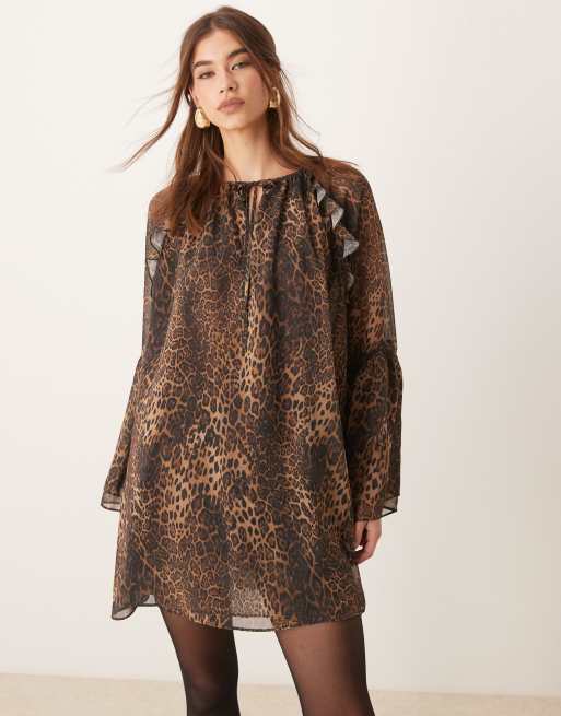 ASOS DESIGN - Mini jurk van chiffon met uitlopende mouwen in luipaardprint