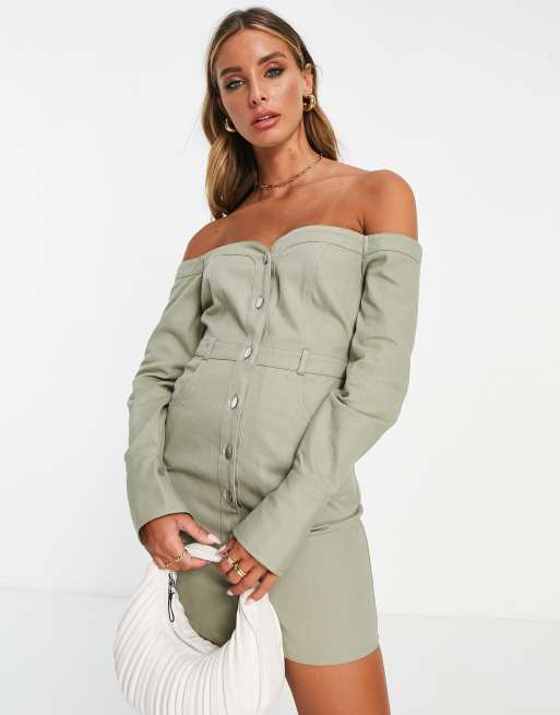 ASOS DESIGN - Mini jurk van keperstof met blote schouders in kaki