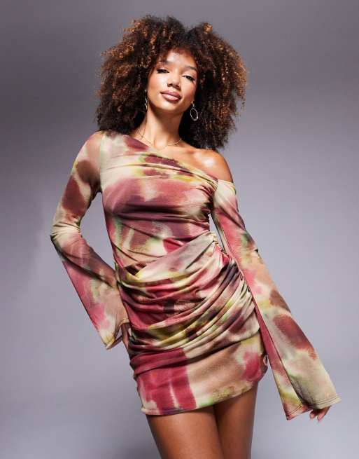 ASOS DESIGN - Mini jurk van mesh met blote schouders, ruches en klokkende mouwen in vervaagde roze print
