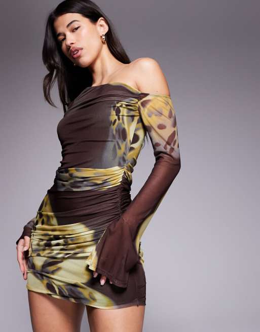 ASOS DESIGN - Mini-jurk van mesh met print, blote schouder en uitlopende mouwen in dierenprint