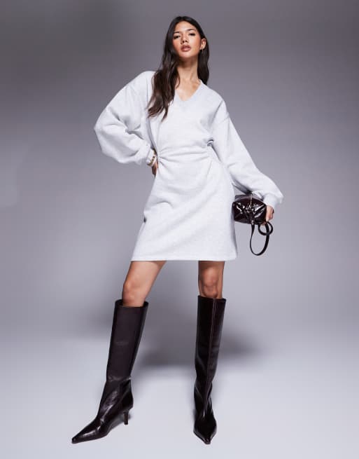 ASOS DESIGN - Mini-jurk van sweaterstof met lange mouwen, V-hals en rimpeleffect in grijs
