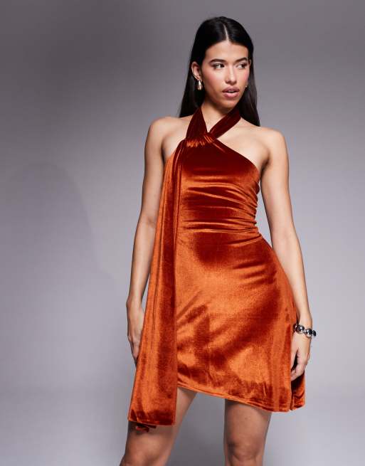 ASOS DESIGN - Mini-skaterjurk van fluweel met halternek in roestbruin