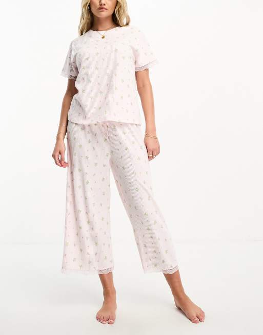 ASOS DESIGN - Mix & Match - Pyjama culotte met fijne bloemenprint, ribbels en kant in roze