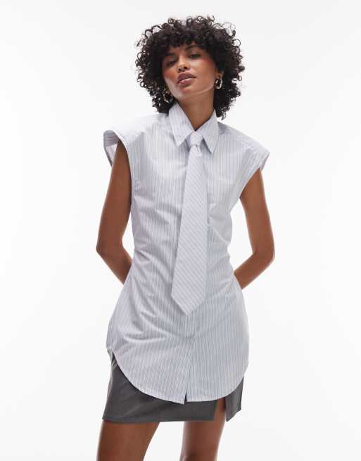 ASOS DESIGN - Mouwloos gestreept overhemd met schoudervullingen en stropdas in blauw