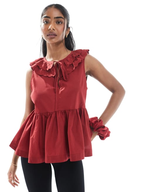 ASOS DESIGN - Mouwloze aangerimpelde top met kraag van broderie en strik aan de hals in bordeauxrood