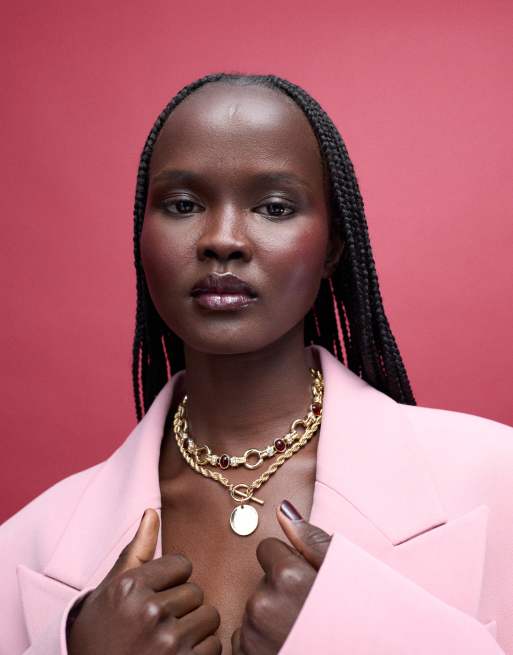 ASOS DESIGN - Multipack kettingen met grove schakelkettingen en set van bordeauxrode steentjes in goudkleur