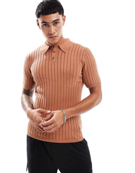 ASOS DESIGN - Muscle fit gebreide polo met brede ribbels in gember met wassing