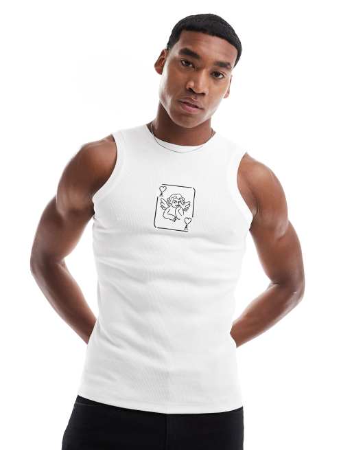 ASOS DESIGN - Muscle fit geribbeld hemdje met abstracte cherubijnprint op de borst