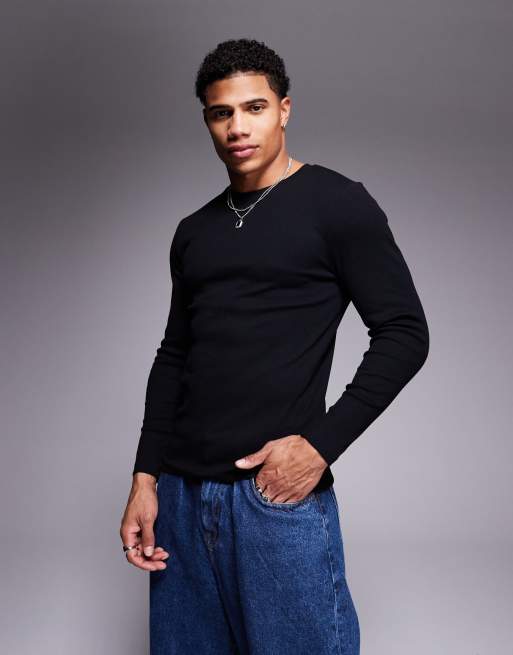 ASOS DESIGN - Muscle fit geribbeld T-shirt met lange mouwen in zwart