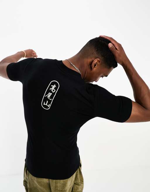ASOS DESIGN - Muscle fit T-shirt in zwart met tekstprint op de ruggengraat