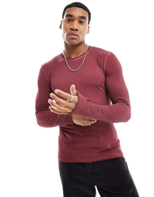 ASOS DESIGN - Muscle fit T-shirt met lange mouwen in rood met olie wassing