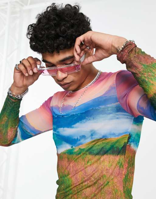 ASOS DESIGN - Muscle fit T-shirt van mesh met lange mouwen en landschapsprint - MULTI
