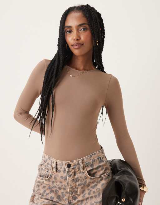 ASOS DESIGN - Naadloze body met lange mouwen en ronde hals in mokka