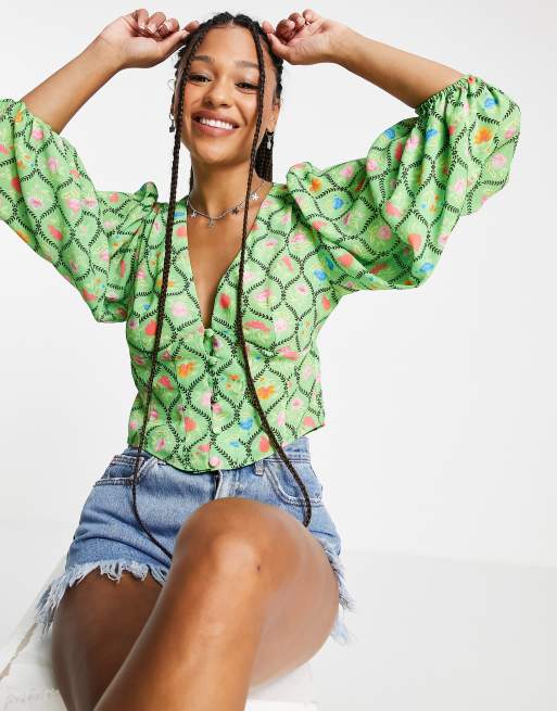 ASOS DESIGN - Nette blouse met knopen aan de voorkant in felgroene bloemenprint