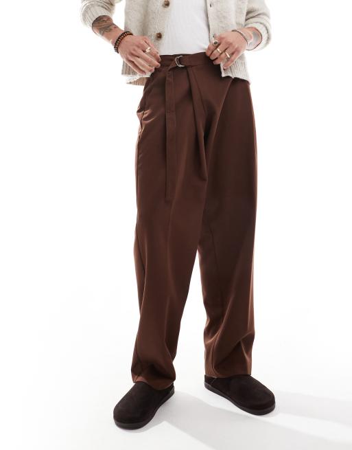 ASOS DESIGN - Nette broek met wijde pijpen en gekruiste riem aan de zijkant in bruin