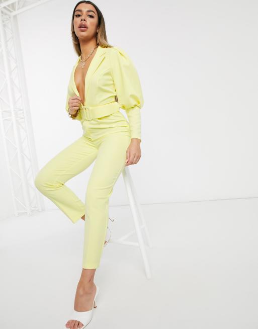ASOS DESIGN - Nette jumpsuit met pofmouwen en strikceintuur in citroengeel